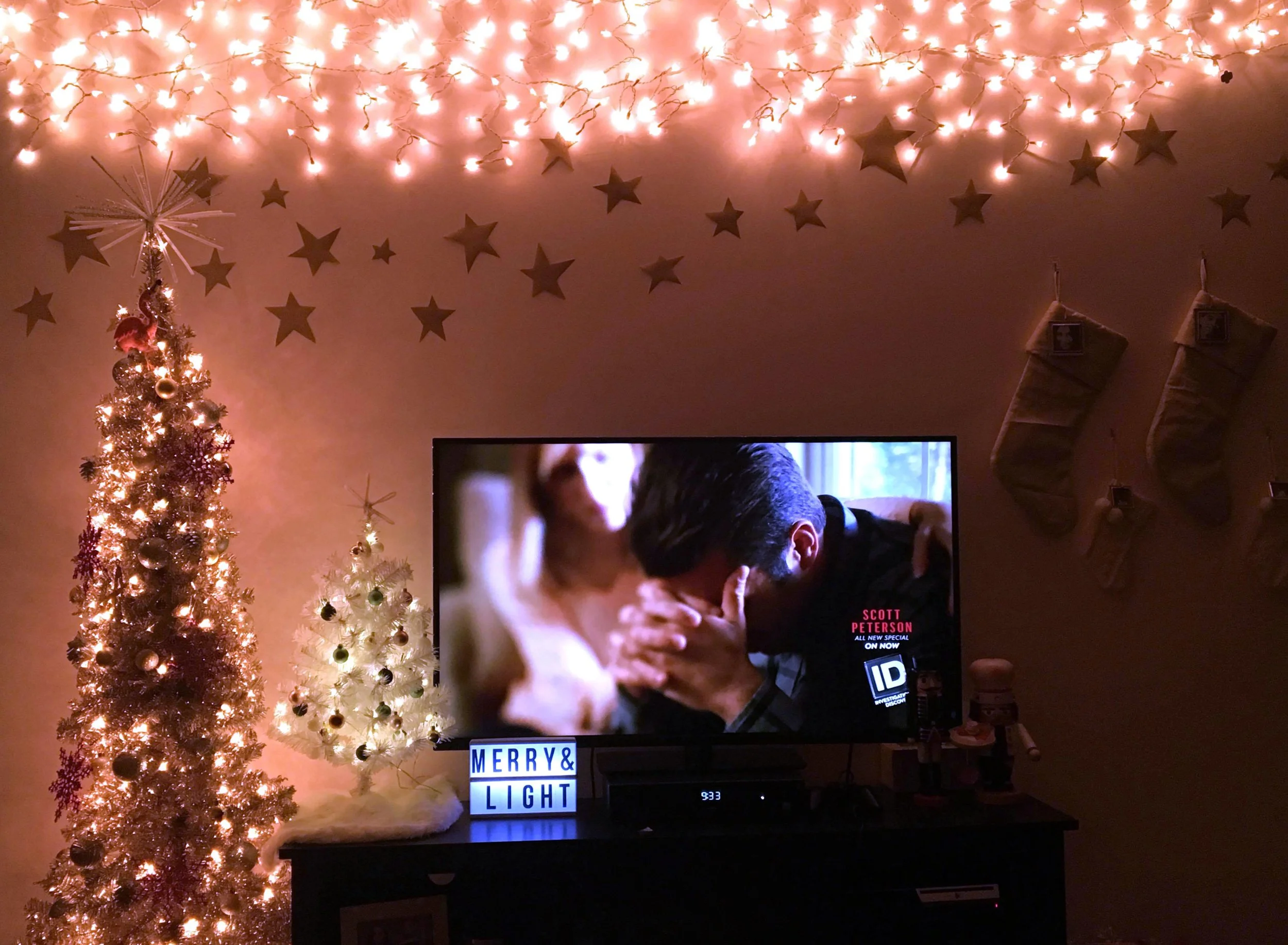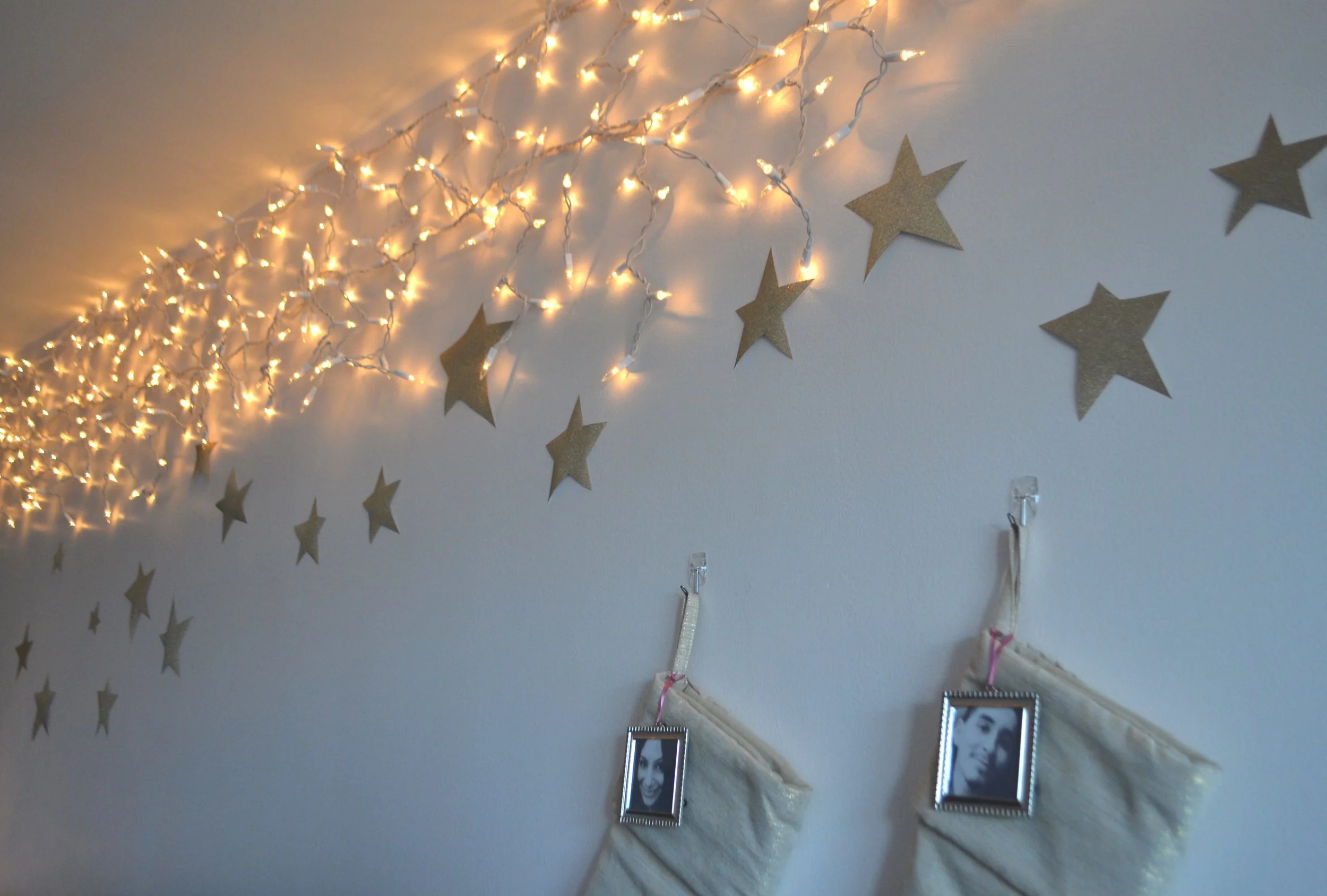 The icicle lights hanging above the stars bring me equal amounts of holiday bliss. They were either going to go around my window frames or on this wall, and this wall won out. Noticing how I created this effect with one string of lights and a pack of command hooks – in a style that you cannot deny was greatly influenced by Joyce’s manic Christmas light hanging in ‘Stranger Things’ Season 1 – makes me laugh. Haa haa! I really loved binge-watching that series last month.