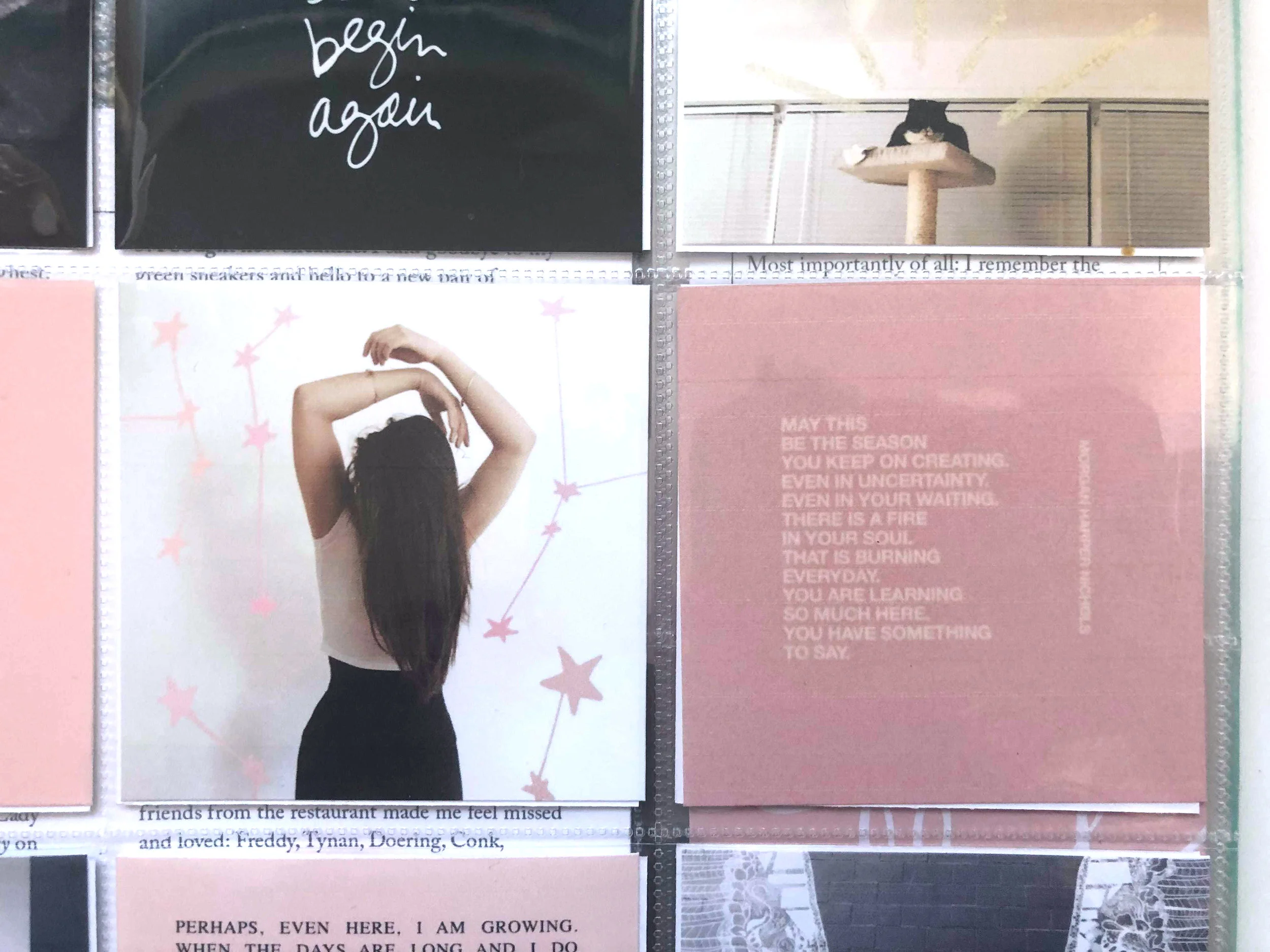 I also used a 9x12 Page Protector with the 3x3 pockets and sized the digital ‘and now let’s begin again’ card from Ali’s January kit to fit the 3x3 pocket. D’ALI!